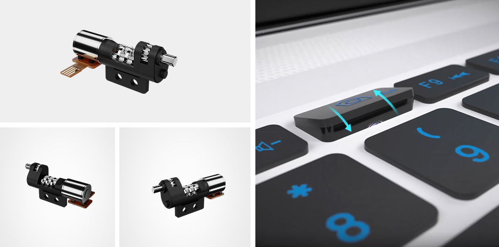 HJC黄金城官网笔记本电脑摄像头翻转驱动系统采用紧凑的微型驱动结构,可在有限的空间内,输出较大力矩,满足厂家追求极致宽屏的需求。
